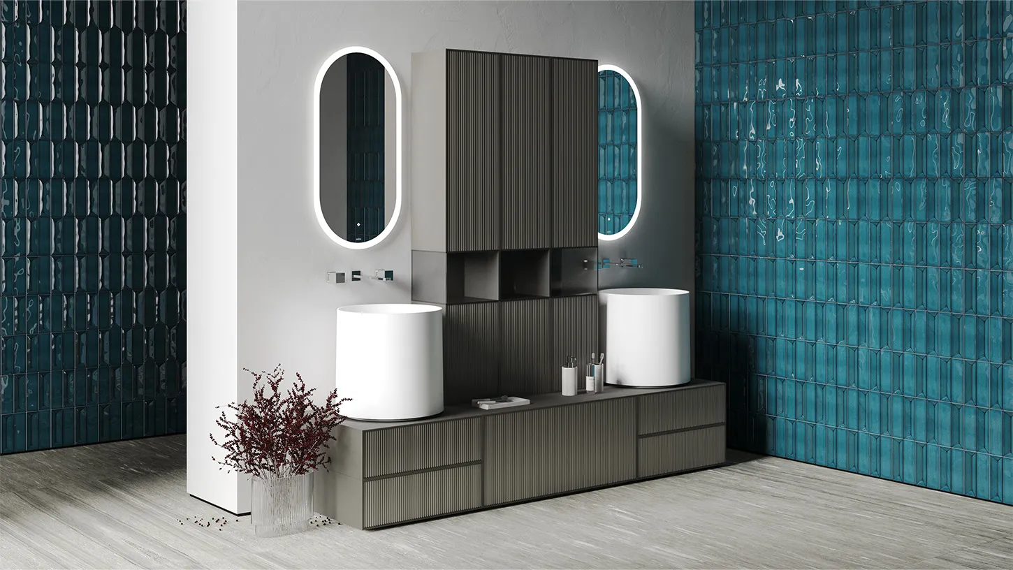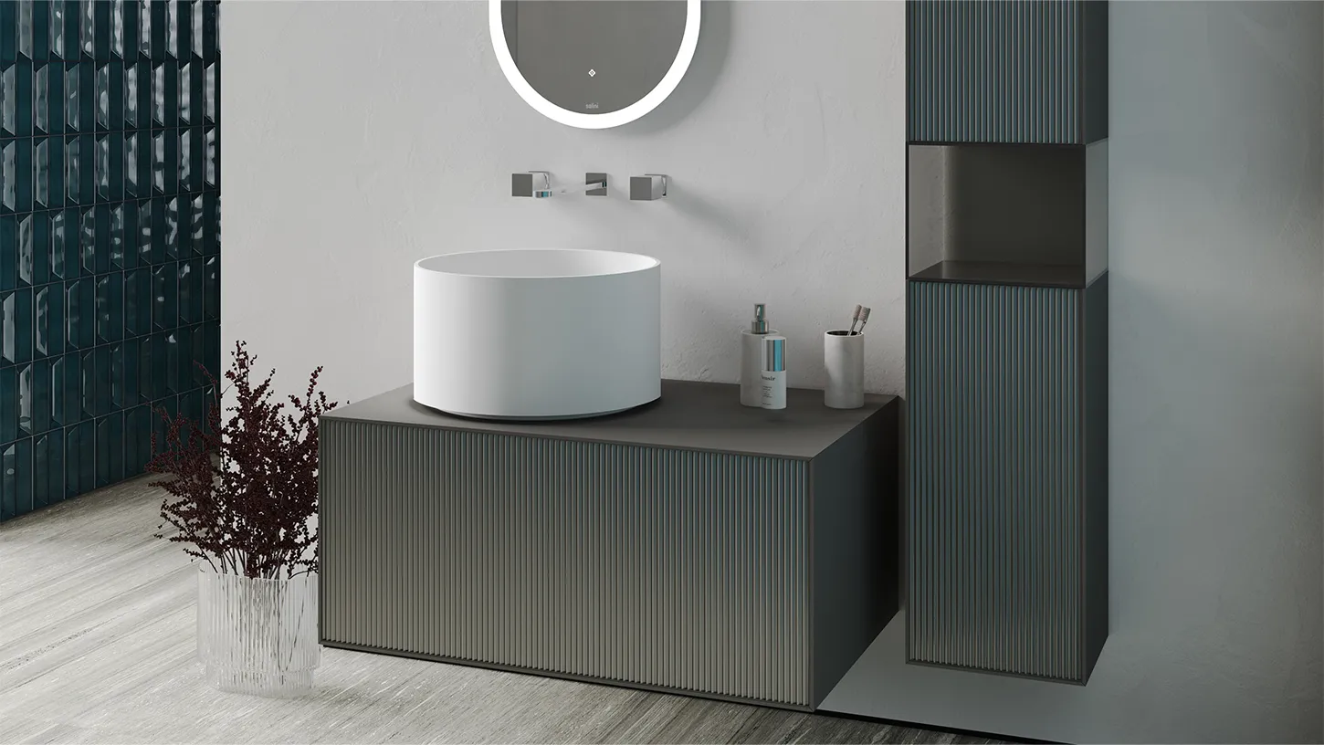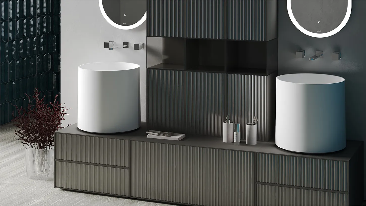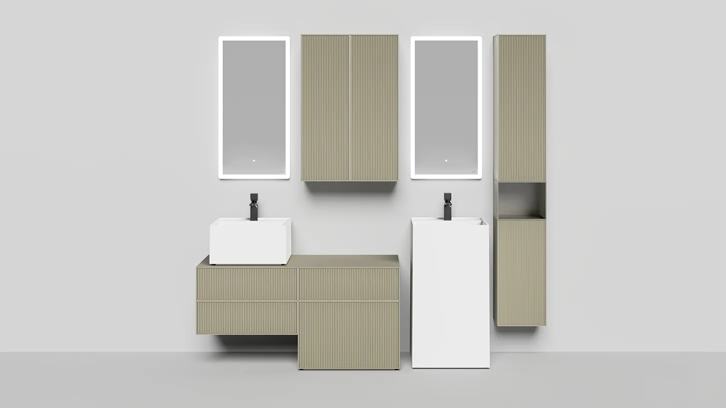 Продуманное комбинирование модулей позволяет создавать как компактные, так и протяжённые композиции мебельных сетов, включающие в себя различные типы раковин, в том числе разной высоты. Широкая вариативность коллекции открывает безграничные варианты для уникального дизайна как компактных, так и просторных ванных комнат.