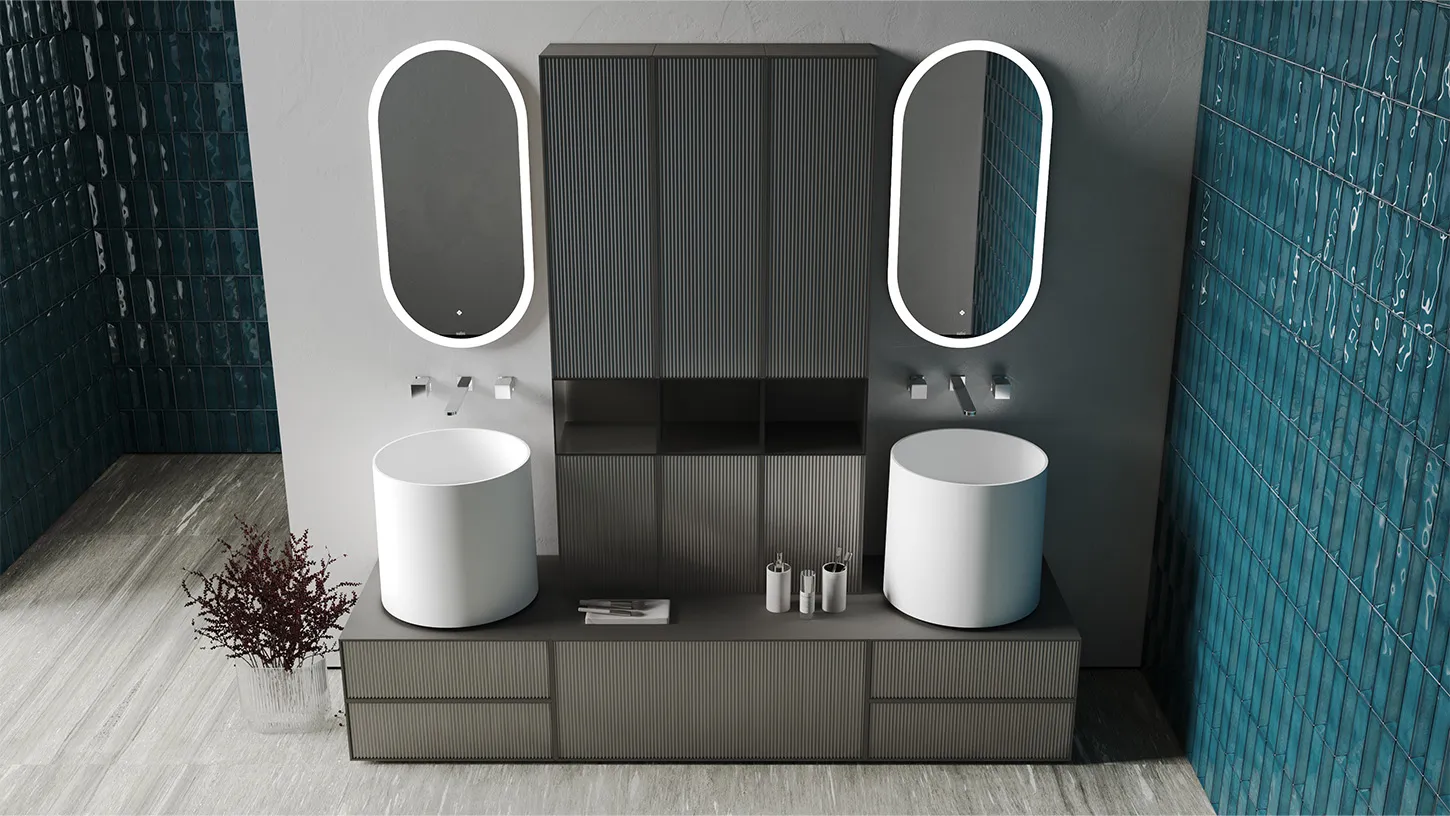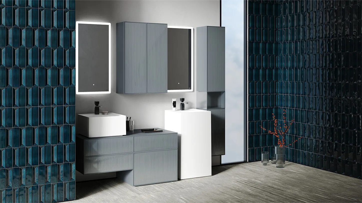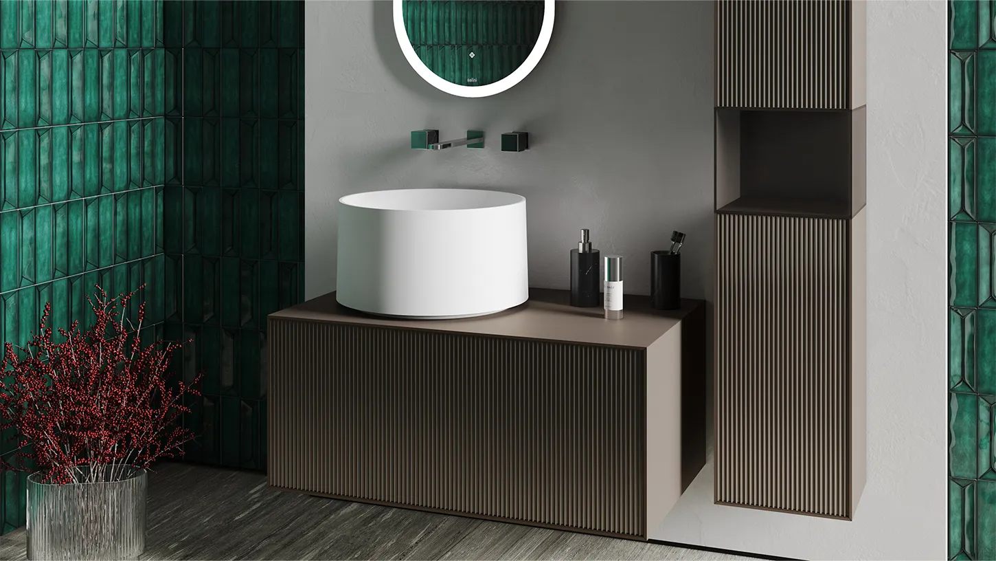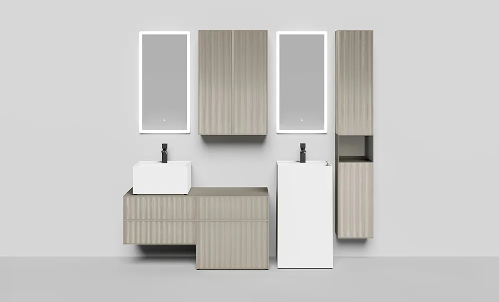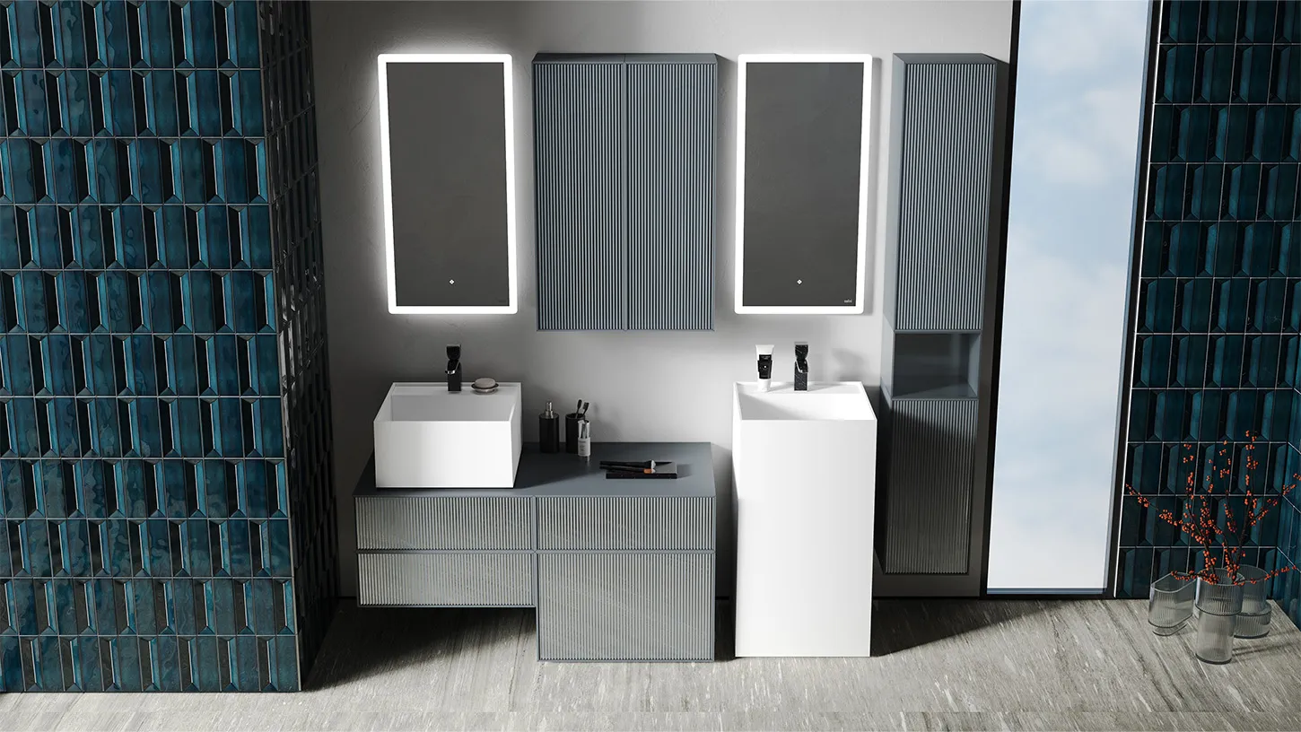Продуманное комбинирование модулей позволяет создавать как компактные, так и протяжённые композиции мебельных сетов, включающие в себя различные типы раковин, в том числе разной высоты. Широкая вариативность коллекции открывает безграничные варианты для уникального дизайна как компактных, так и просторных ванных комнат.