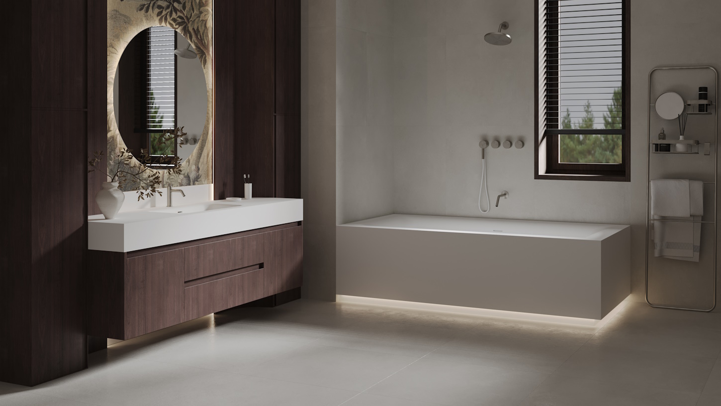 Широкий архитектурный кант формирует выразительную графичную линию — тонкий монолитный срез, подчёркивающий статус. Эта плоскость становится идеальной основой для интеграции в мрамор, оникс или эксклюзивные композитные панели.